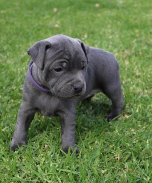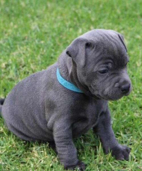 All our KC-registered blue Staffordshire Bull Terrier puppies come from parents thoroughly tested and clear for L-2-HGA and HC-HSF4. Pups receive their first vaccinations, worming, and a full vet health check before leaving us.